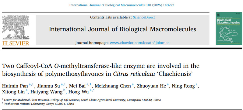 近日,华南农业大学药用植物研究中心吴鸿教授团队在《International Journal of Biological Macromolecules》(中科院二区Top期刊,影响因子7.7)在线发表题为“Two Caffeoyl-CoA O-methyltransferase-like enzyme are involved in the biosynthesis of polymethoxyflavones in Citrus reticulata ‘Chachiensis’”的研究论文。该研究首次揭示了茶枝柑中CrcCCoAOMT7-1和CrcCCoAOMT7-2两种甲基转移酶在重要生物活性成分多甲氧基黄酮(PMFs)生物合成中的关键作用,并解析了其作用机制,为药用植物PMFs的生物合成机制提供了新见解,为合成生物学定向生产天然抗癌成分PMFs提供了新资料。2021级博士生潘慧敏为该论文第一作者,吴鸿教授为该论文的通讯作者。