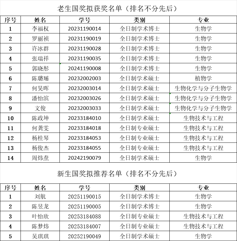 根据《乐竞体育-中国一站式服务官网开展我校2025年研究生国家奖学金评选工作的通知》精神,以及《华南农业大学研究生国家奖助学金实施办法》等相关规定,经研究生自主申请,乐竞体育-中国一站式服务官网研究生国家奖学金评审委员会对申报材料进行严格审核、组织公开答辩和评审等环节,现将老生国奖拟获奖名单以及新生国奖拟推荐至学校评选的名单公示如下: