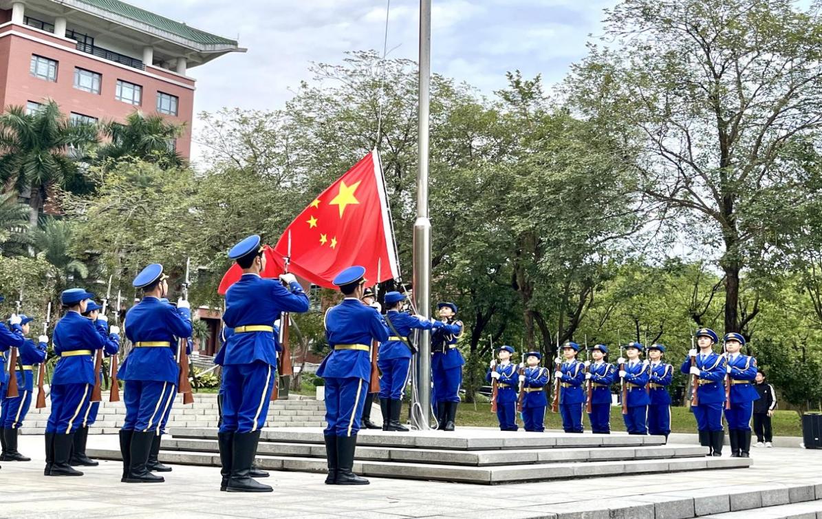 迎着初升的朝阳,国旗护卫队迈着铿锵有力的步伐,庄严护送国旗入场。全体师生肃立注目,齐唱国歌,五星红旗在激昂的旋律中冉冉升起,激发了现场师生对祖国的崇高敬意与赤子情怀。